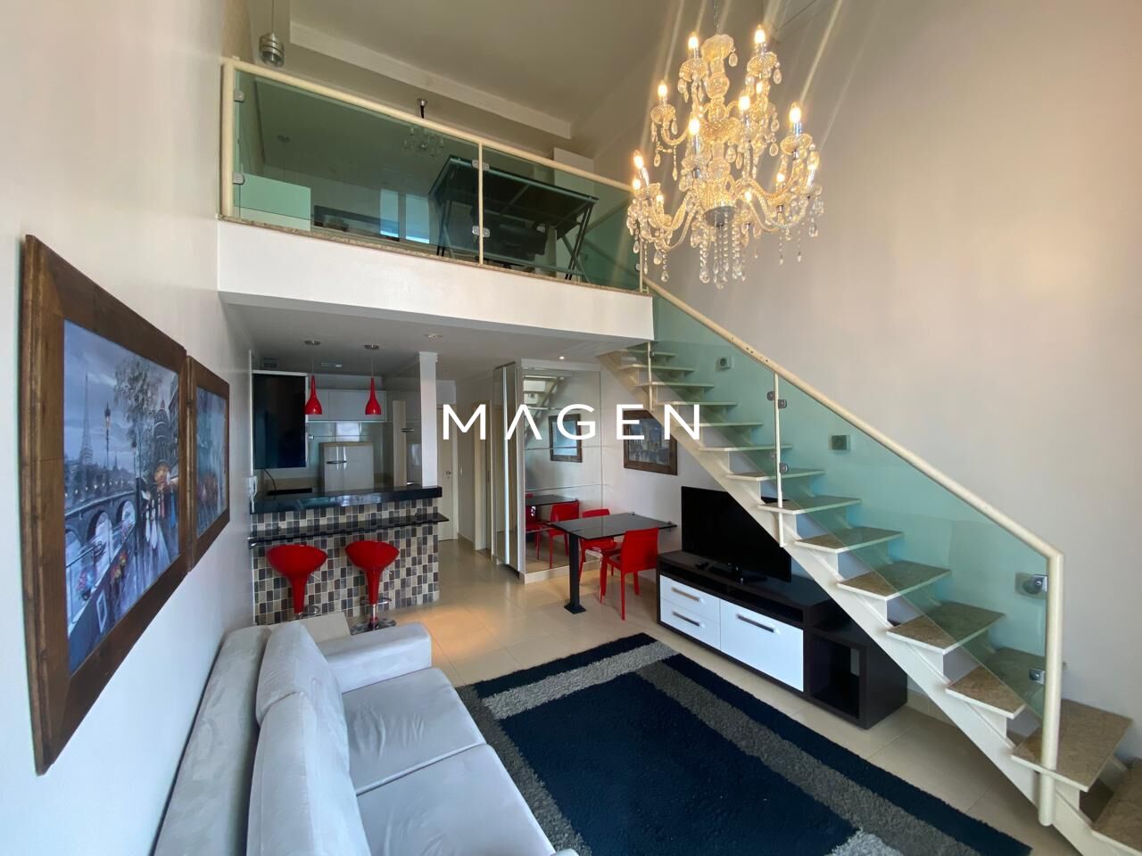 No piso inferior, o imóvel conta com uma cozinha equipada, pronta para uso no dia a dia, além de um lavabo funcional. A sala de jantar integrada à sala de TV cria um espaço harmonioso e convidativo para receber visitas ou simplesmente relaxar. A sacada, com vista panorâmica para o parque, complementa o ambiente com iluminação natural e uma atmosfera agradável.