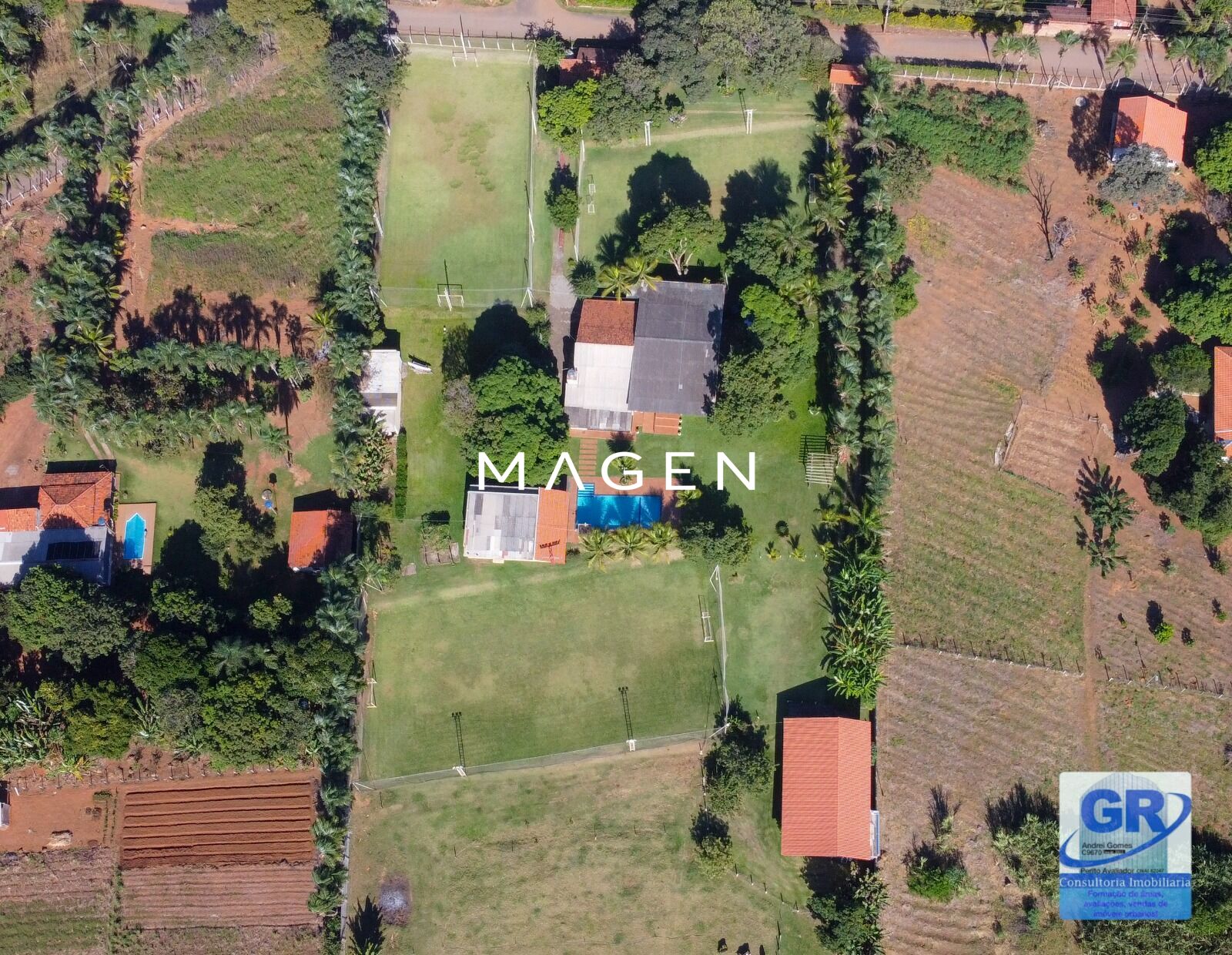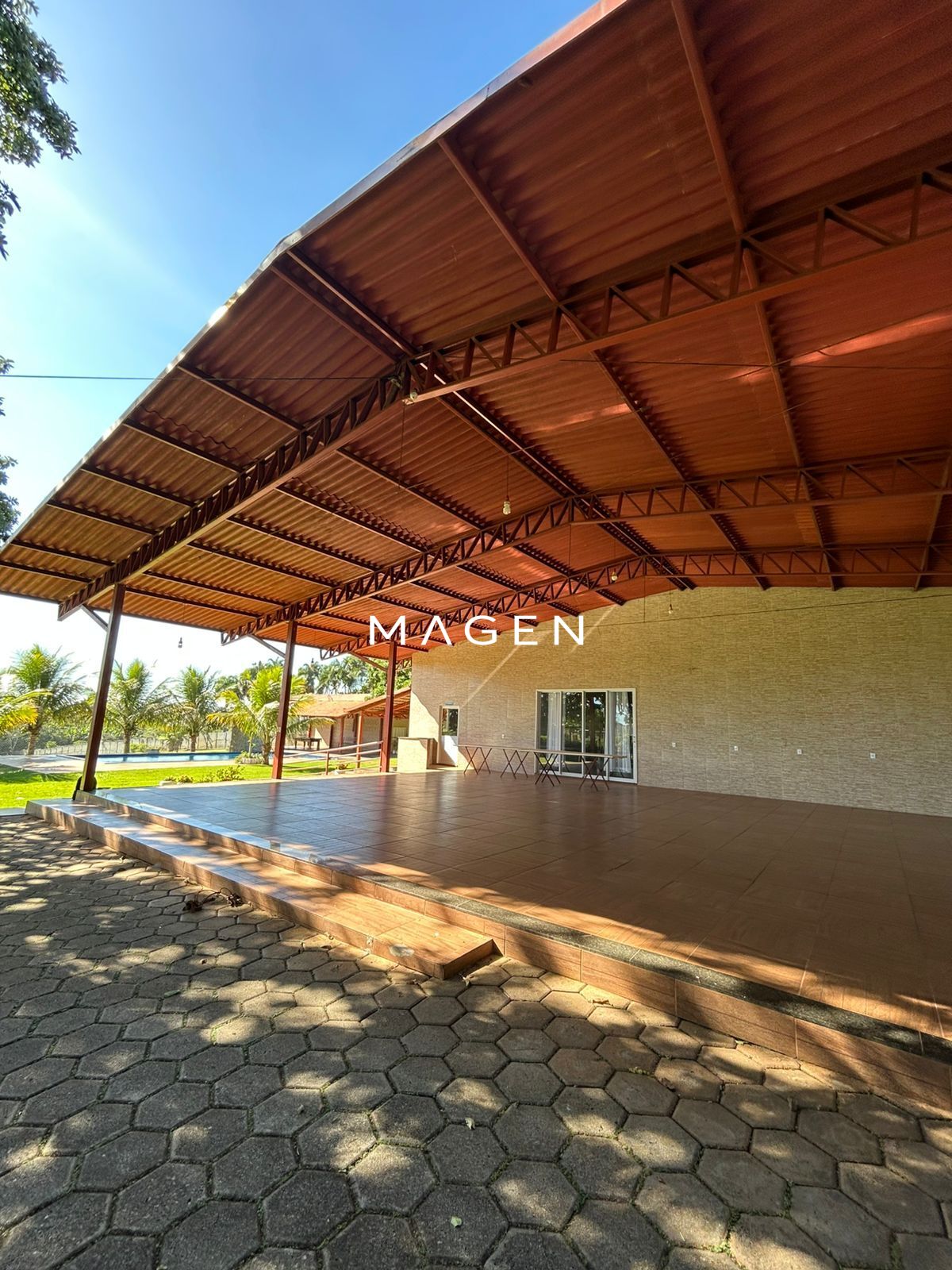 A casa principal possui dois quartos, sala, cozinha ampla, banheiro com três sanitários femininos e dois masculinos (todos com chuveiro), além de área de churrasco e um galpão de festas com capacidade para até 300 pessoas.